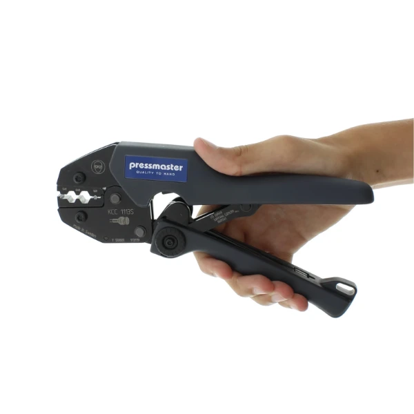Krimptang met sperinrichting voorzien van ergonomische handgrepen voor de montage van RG58, RG59 RG62 en RG71 6.48/5.41/1.69mm AF coaxiaal-connectoren.